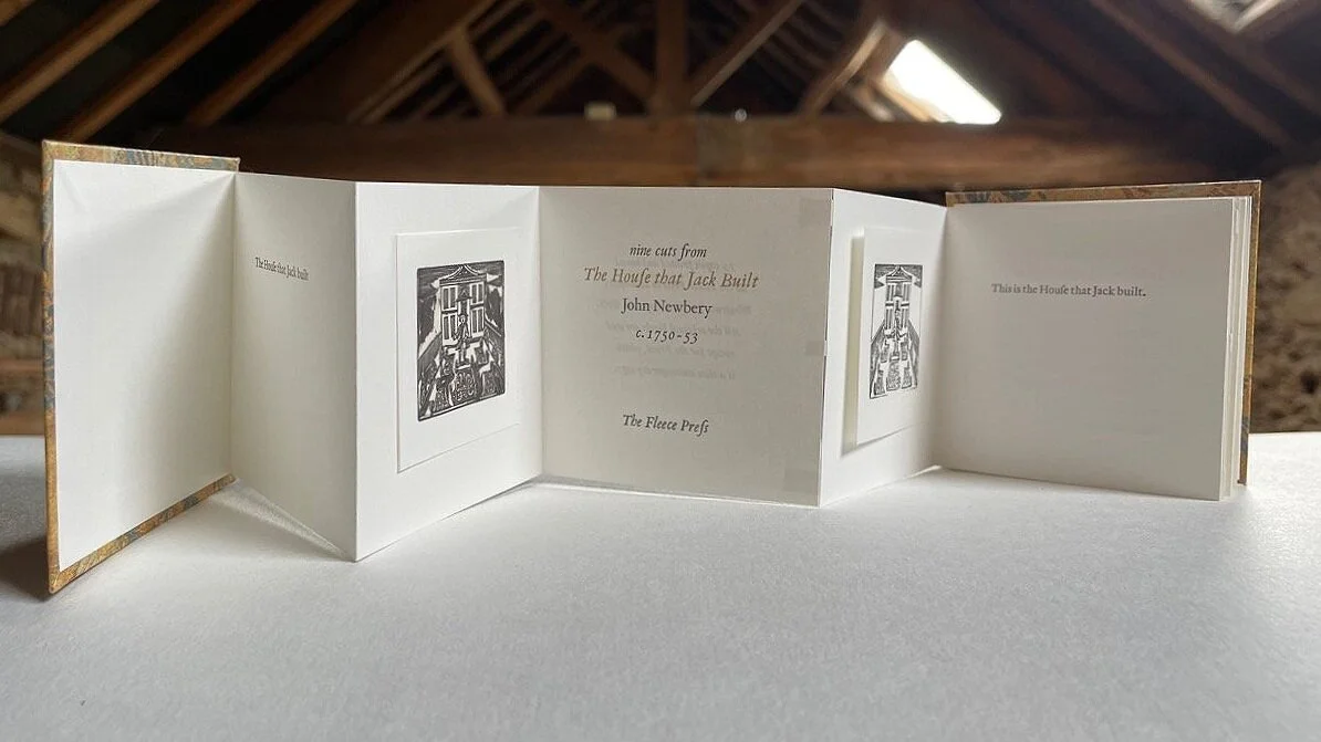 There are also 75 specials (65 for sale), as shown in the fourth and fifth images on this page (again, click to enlarge). In these specials, the miniature described above is joined by a double-sided accordion-fold book of The House that Jack Built, following the original words (and the long s), illustrated by nine of the original ten blocks used by John Newbery in the first ever edition, c. 1750. These HTJB copies have been bound at the Press and are housed in a special box made by Stephen Byrne; the price is £355.